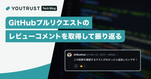 こんにちは、YOUTRUSTのしぶしゅん(YOUTRUST/X)です。 今回はGitHubプルリクエストのレビューコメントを取得して振り返る取り組みを行いましたので紹介します。 普段プルリクエストをレビューするときはレビュワーとして担当になったプルリクエストだけを…
