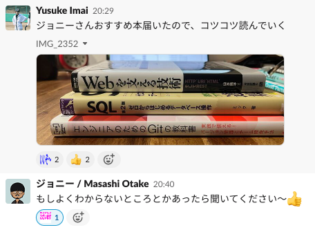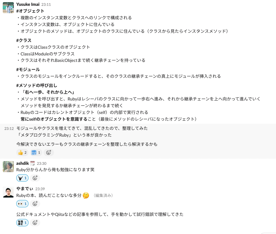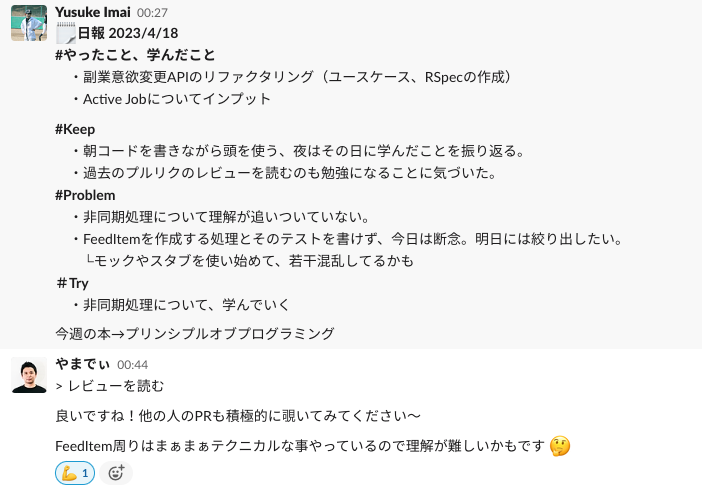 そこでSlackチャンネルで直近学んだことを定期的に投稿をしました。 投稿に対して、エンジニアの皆さんからコメントをいただけるので、自分の学習の方向性を再確認することができました。