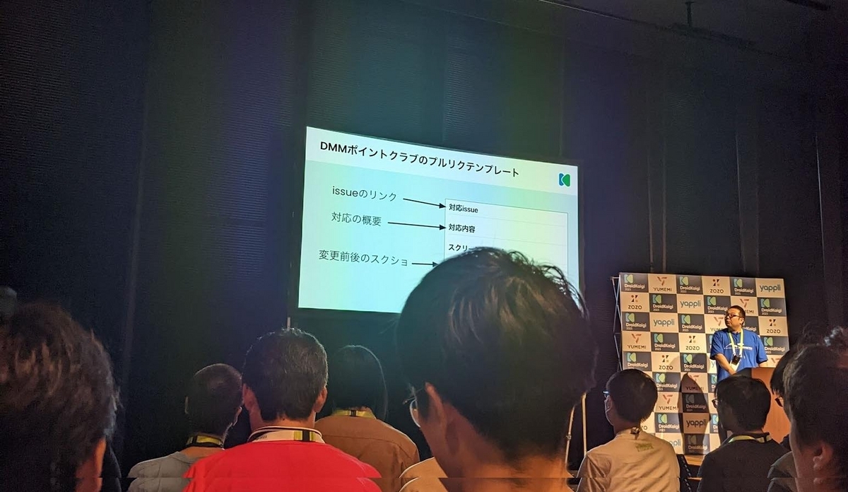 「DMMポイントクラブ」「DMM TV」「DMMブックス」の3つの開発チームの事例を元に、実際に行われているコードレビューの流れや、チームで工夫していること、改善していきたいこと個人で取り組んでいること、実際に使っているPRテンプレートなどを紹介されていました。