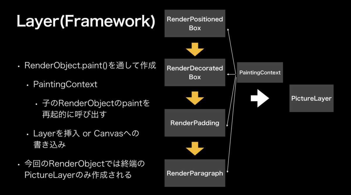 守谷さんは発表の中で、すべてのウィジェットからSkiaやImpellerまでの処理の流れを説明されました。特に知らなかった点は、コードがレイヤー層に到達した段階でC++に変換されることです。