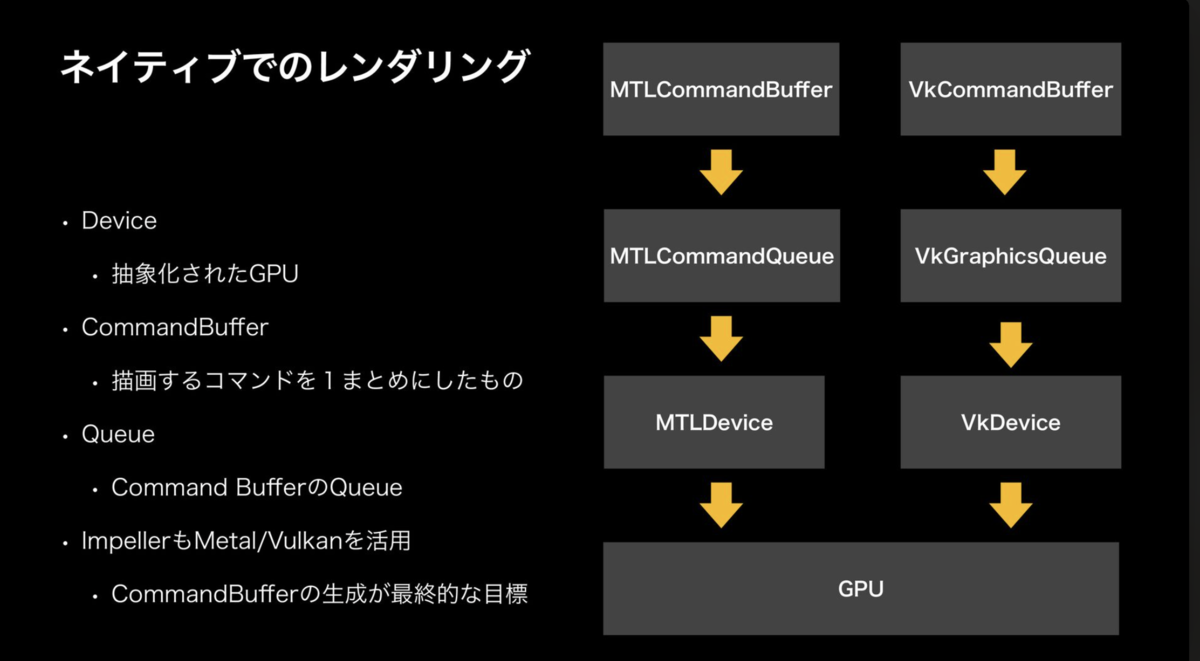 個人的にもう一つ面白いと感じた点は、VulkanとMetalは異なるAPIであるにもかかわらず、次の画像を見ると、かなり似たような処理を行っていることです。