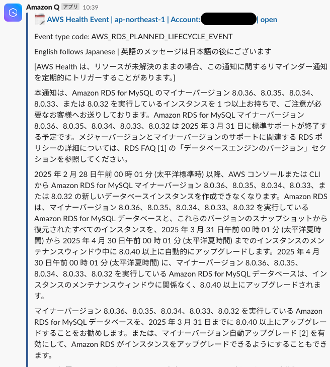 2024年XX月AWS Healthより下記のようなありがたくも嬉しくはないRDS MySQLバージョンのEOL*1通知が届きました。😂