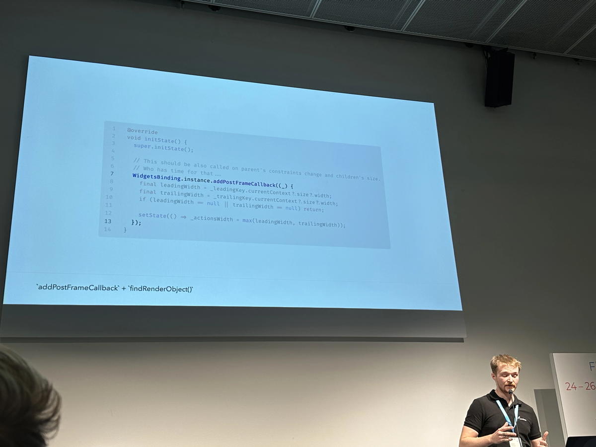 次に紹介されたのが「描画完了後にサイズを取得して反映させる」テクニックです。 addPostFrameCallback と findRenderObject() を組み合わせると実現できます。