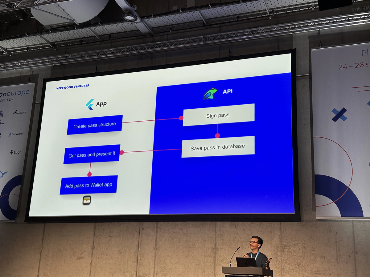 今回のセッションでは、Apple WalletのパスをFlutterでフルスタック構築する方法 が紹介されました。例えばカンファレンスに参加するとき、カスタムのイベントパスをウォレットに追加できるようになります。その実装に使われたのが apple_passkit パッケージです。