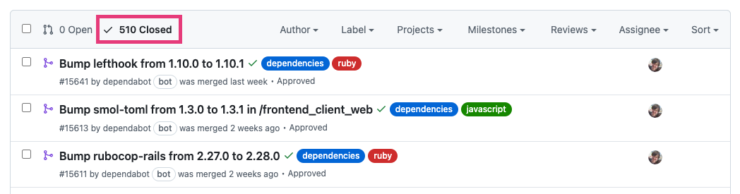 まず、毎朝出勤してから10分から30分ほどライブラリのバージョンアップに時間を使って、Dependabotによって作成されたPRをmergeしてから業務を開始しています。
