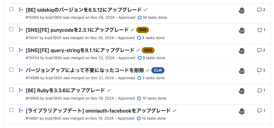 私がSREに異動したのは2024年8月からですが、もともと技術的負債の解消やライブラリのアップグレードには強く関心があったので、SREに異動する前のプロダクト開発エンジニアの頃から各種ライブラリのバージョンアップに取り組んでいました。