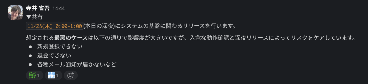 - 万が一の際に影響範囲を抑えられる時間帯にリリース