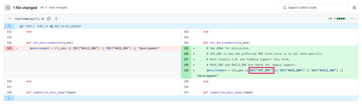 リリースノートではなくcommitを1つ1つ読み進めていくと、こちらのcommitで環境変数RAILS_ENV