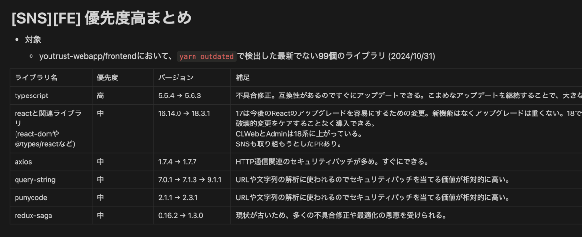 また、どのライブラリのバージョンを優先的に上げていくかの判断は、バックエンドはbundle outdated